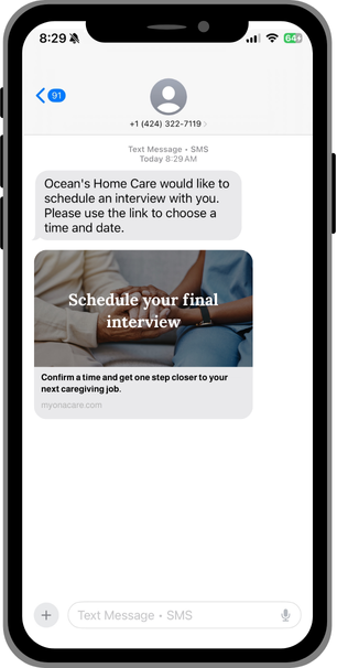 Caregivers receive their interview invitations directly by text, with clear details and a quick way to confirm.Confirmation Prompts